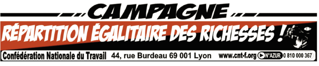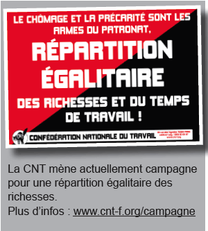 du marché. Une autre répartition des richesses est possible et il est urgent d’organiser une riposte sociale d’envergure. En ce début d’année 2012, la CNT poursuivra donc sa campagne « Pour une répartition égalitaire des richesses ! » afin de convaincre la population de la possibilité d’imposer une autre politique.