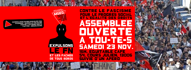 Nous appelons tou-te-s les Marseillais-e-s à venir y débattre d’une campagne anti-FN et antifasciste sur le long terme et à la constitution de comités locaux ou sectoriels dans tout le département.