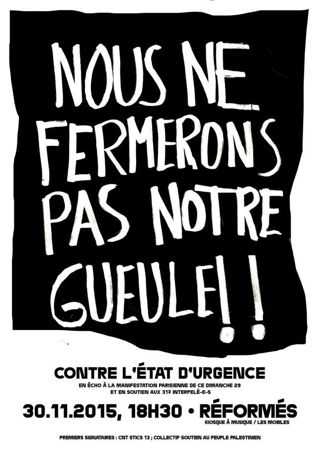 Á l’heure où nous écrivons, 317 personnes ont été interpellées à l’issue de la manifestation contre la COP 21 organisée à Paris le 29 novembre 2015 ; la dérive sécuritaire de l’État s’accentue. Nous ne nous laisserons pas bâillonner !