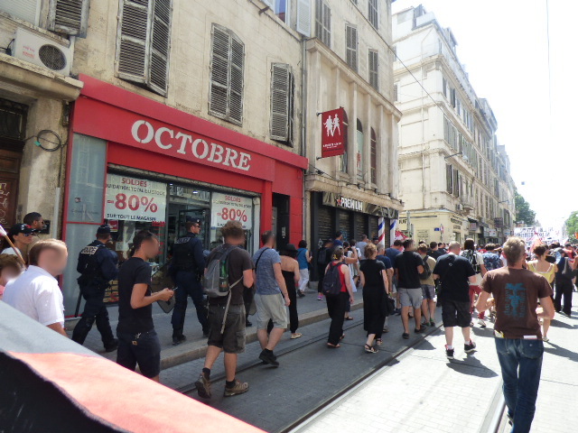 La journée commence par un rassemblement devant le commissariat de Noailles en solidarité avec une camarade arrêtée et placée en Garde À Vue toute la nuit, pour avoir simplement scandé un slogan lors de la venue du Ministre de l’Intérieur B. Cazeneuve à la Villa Méditerranée.