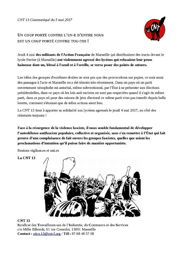 La CNT 13 tient à apporter sa solidarité aux lycéens agressés le jeudi 4 mai 2017, au côté des résistants toujours !