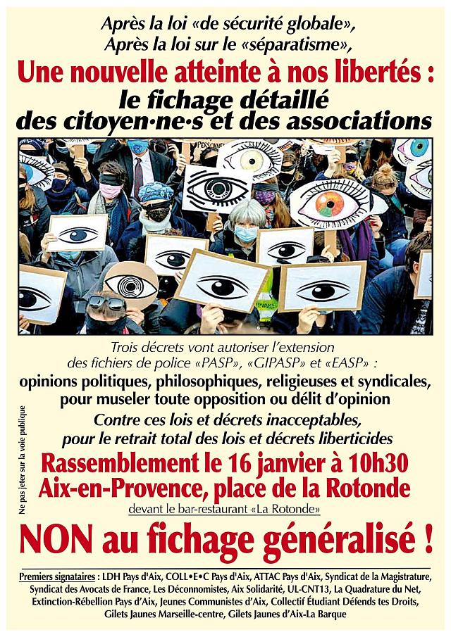Refusons les mesures autoritaires de l’État ! Exigeons un plan sanitaire et social d’urgence ! Manifestation Samedi 16 janvier 2021 • 10h30 à La Rotonde à Aix-en-Provence • 14h30 au Vieux-Port à Marseille