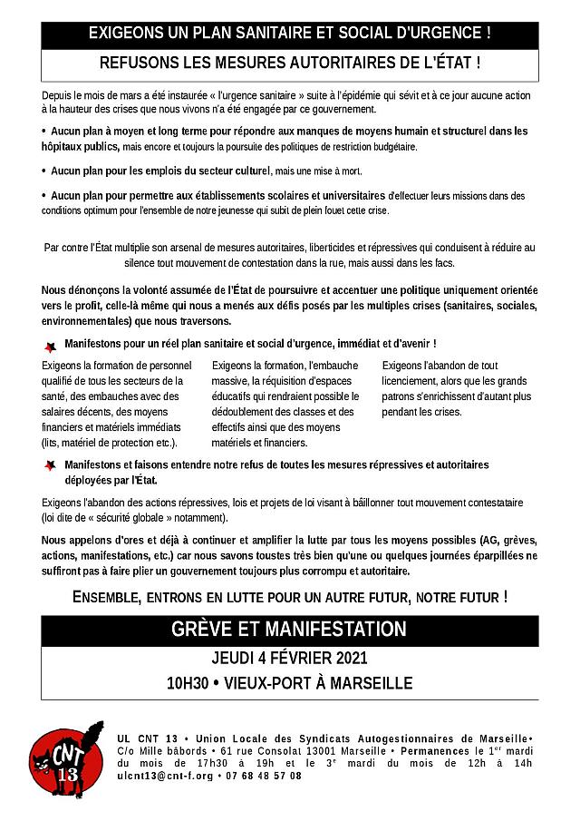 JEUDI 4 FÉVRIER 2021 - 10H30 au Vieux-Port à Marseille Journée de Grève et Manifestations interprofessionnelles et partout en France ! Travaille, consomme et ferme ta gueule : de cette société là on n’en veut pas !!!