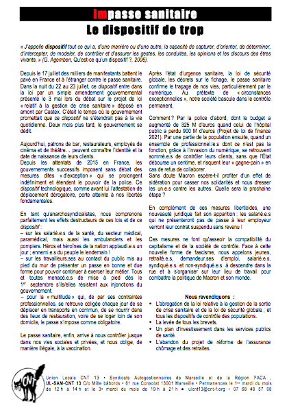 Refusons les mesures autoritaires de l’État ! Exigeons un plan sanitaire et social d’urgence ! Manifestation Samedi 16 janvier 2021 • 10h30 à La Rotonde à Aix-en-Provence • 14h30 au Vieux-Port à Marseille