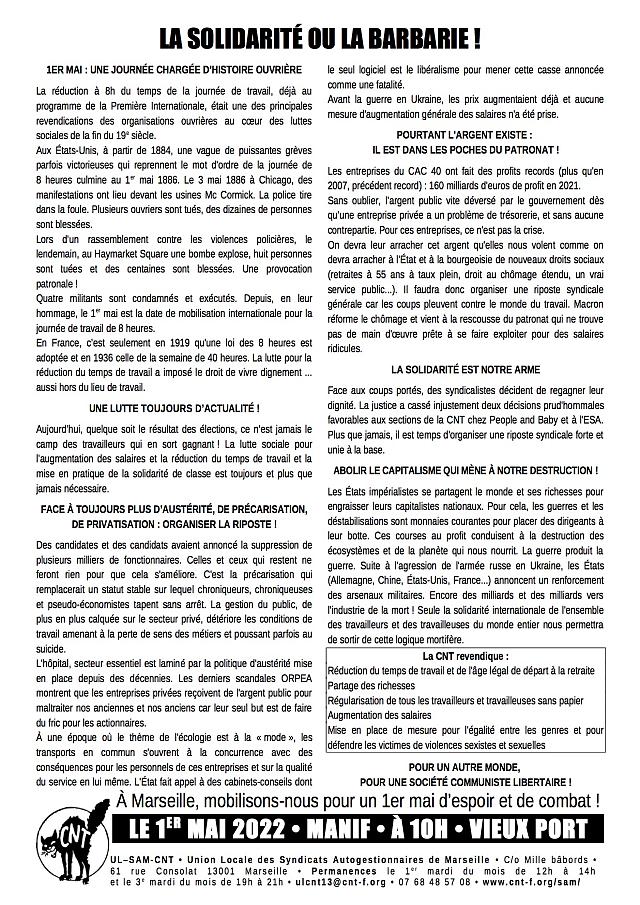 1er mai : manifestation syndicaliste révolutionnaire pour l’égalité et la transformation sociale