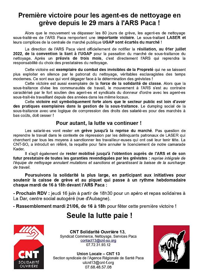 Communiqué commun du syndicat du Nettoyage CNT-Solidarité Ouvrière 13 & de la section syndicale de l’ARS de la CNT 13