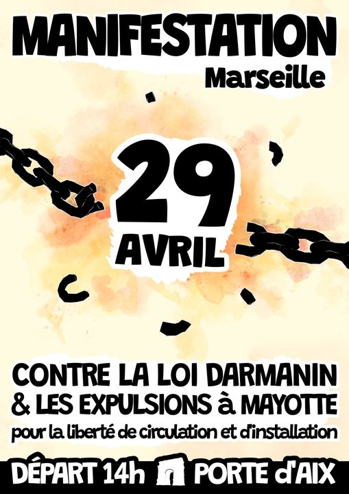 Signé par : AITE (Accueil Information de Tous les Etrangers), Al Manba, Alarmphone Marseille, Antifa Social Club Marseille, Association des juristes pour la reconnaissance des droits fondamentaux des immigrés, ASSO Solidaires 13, CGT comité Chômeurs Précaires 13, CGT Educ’Action 13, La Cimade Marseille, CNT-F 13, CNT-SO 13, Collectif 113, Collectif 5 novembre, Collectif anti-CRA Marseille, Collectif coeur d’une mère, Collectif des familles, Collectif des femmes engagées comoriennes de France, Collectif FLE Marseille, CISR (Collectif International pour le Soulèvement Révolutionnaire), CRRI (Collectif de résistance contre le racisme institutionnel), Du Pain et des Roses, Ensemble pour notre régularisation, Espace, Ligue des droits de l’homme Marseille, Marseille Colonial, Marseille Gaza Palestine, Marseille Espoir, Mémoires en marche, Mdzadze Wayi Rumbi, Mille Babords, Parole Solidarité Décider, RESF 13, RUSF 13, Solidaires 13, Solidaires Etudiant.es Aix-Marseille, Soutien 59 Saint Just, Suhulu, Technopolice Marseille, Tous Réfugiés, UCL Marseille