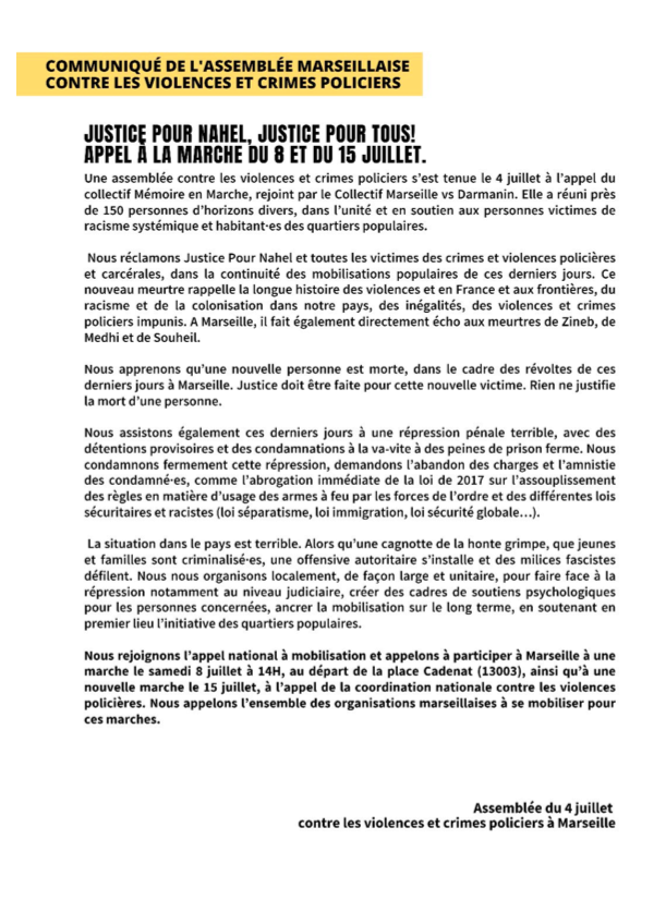 Justice pour Nahel, justice pour Tous ! Appel à la marche du 8 et du 15 juillet